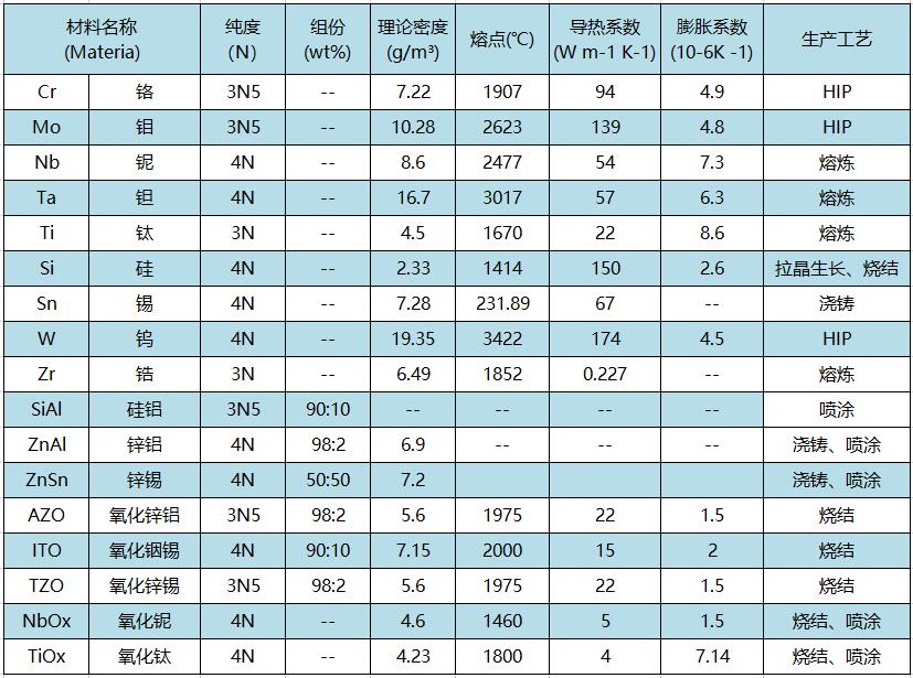 燦元在大面積玻璃領域中主要提供以下靶材產品: